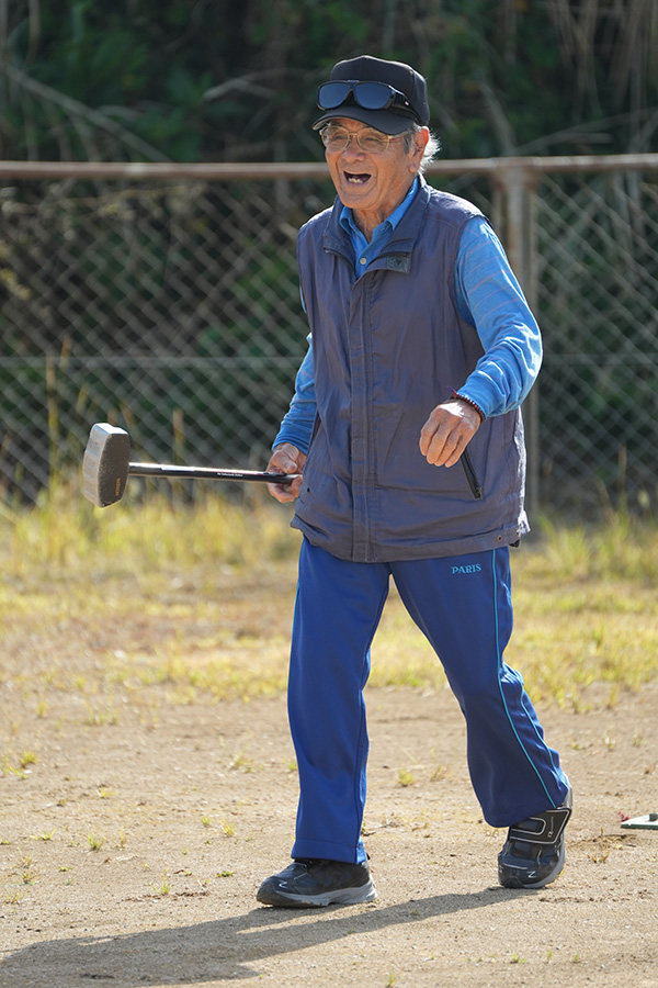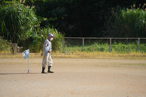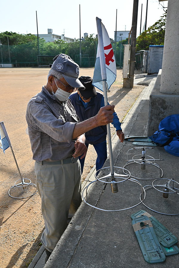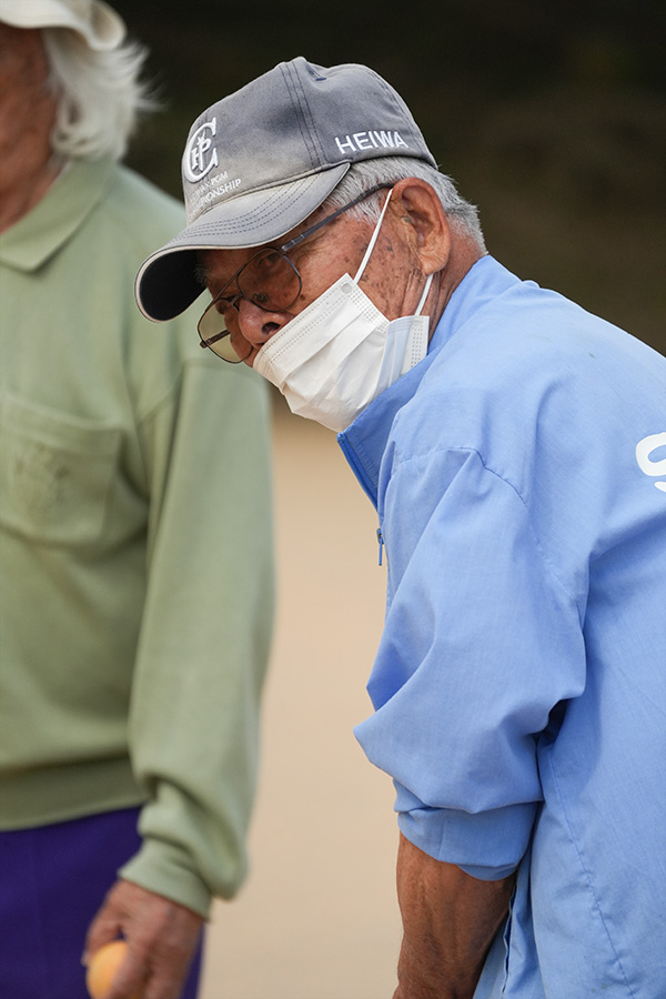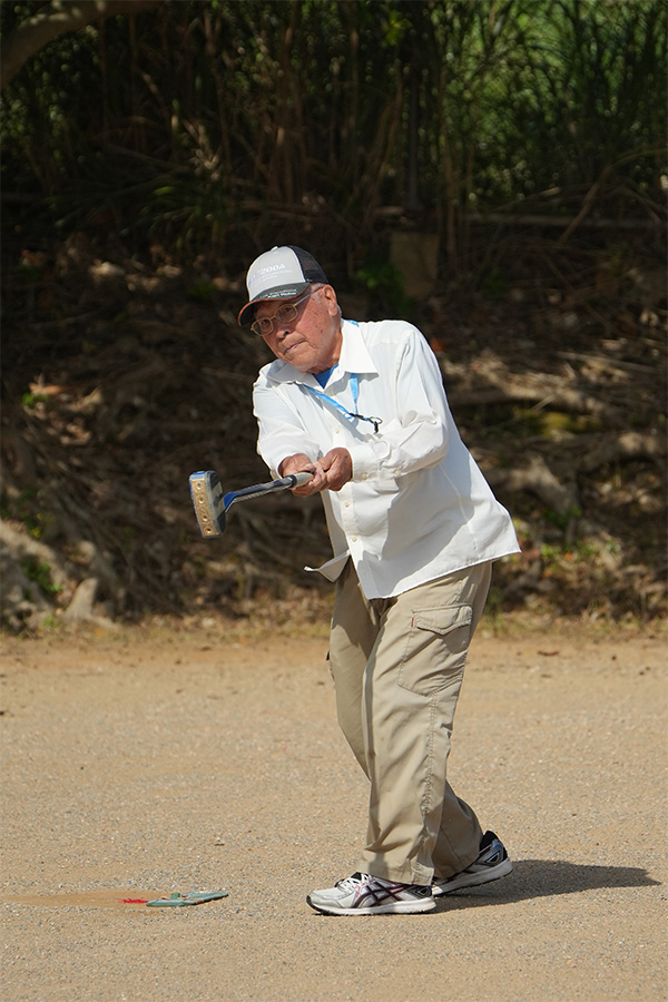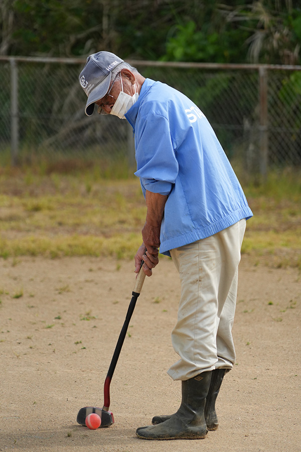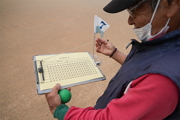 会員の方のお話だと、渡慶次グラウンド全体を使ってプレーするので、競技を終えるころには3千歩から4千歩近くを歩く勘定になり、自宅にいるよりはるかに健康的だそうです。又、ホールインワン賞もあり、ティッシュ1箱がもらえるので、それも楽しみだともおっしゃっていました。