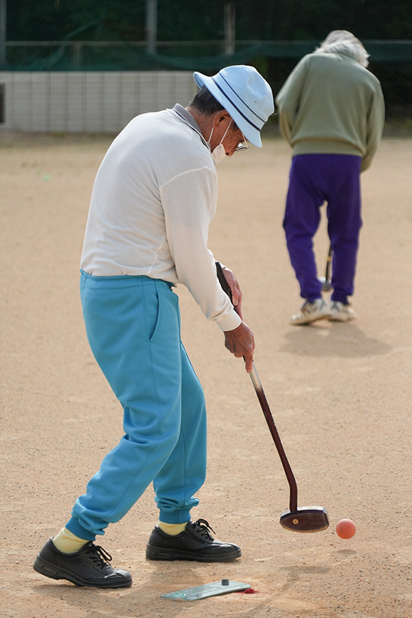 グラウンドゴルフでは専用のクラブ、ボール、ホールポスト、スタートマットを使用して、ゴルフのようにボールをクラブで打ち、ホールポストにホールインするまでの打数を数え競います。