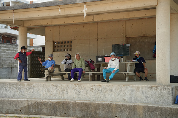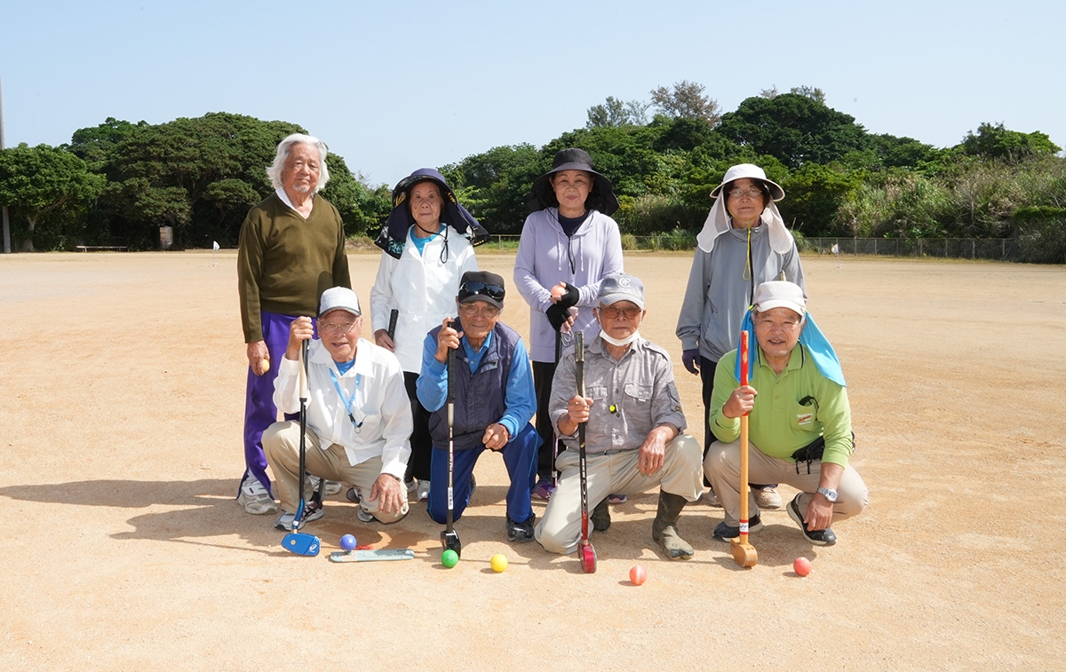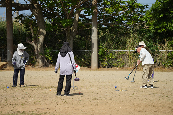 グラウンドゴルフ愛好会の活動日は、毎週月曜日と金曜日。渡慶次グラウンドへ集まりゲームを行っています。
