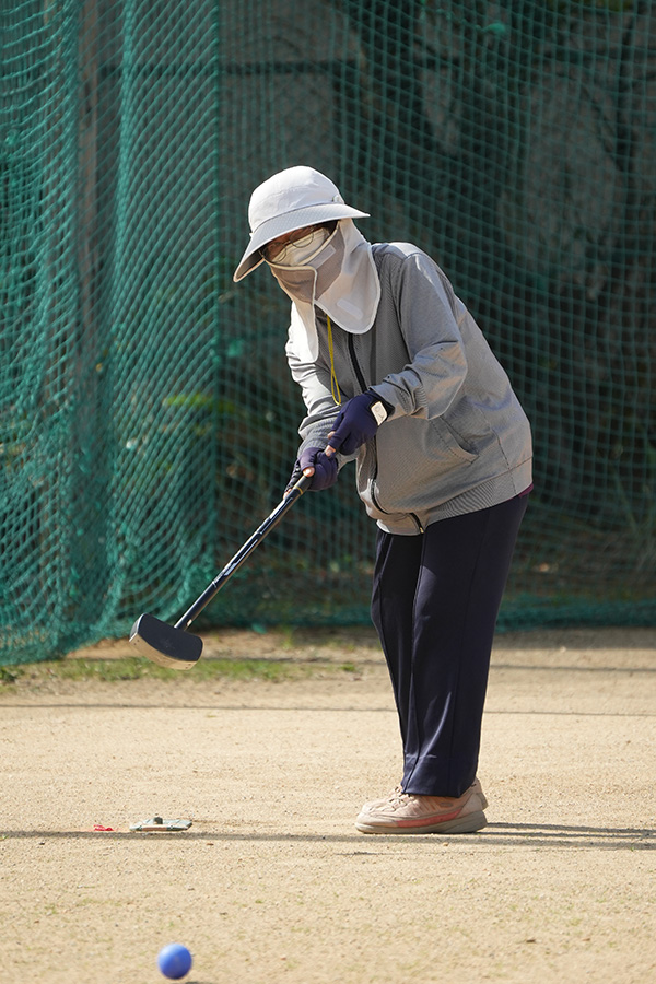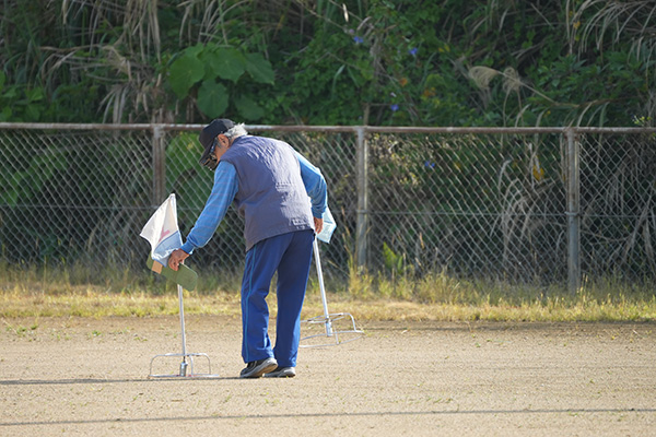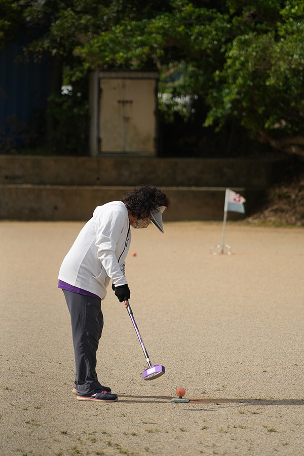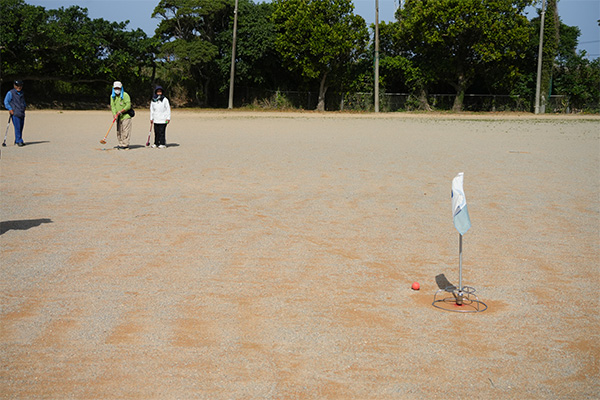 会員の方のお話だと、渡慶次グラウンド全体を使ってプレーするので、競技を終えるころには3千歩から4千歩近くを歩く勘定になり、自宅にいるよりはるかに健康的だそうです。又、ホールインワン賞もあり、ティッシュ1箱がもらえるので、それも楽しみだともおっしゃっていました。