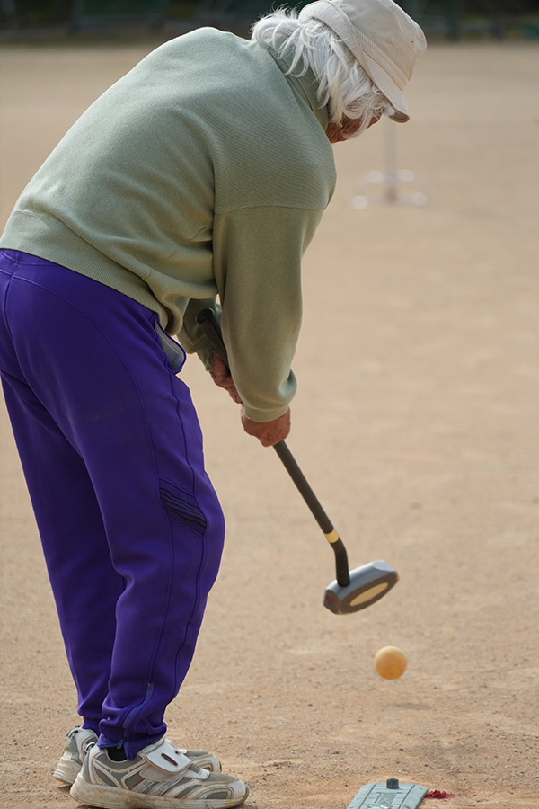 グラウンドゴルフでは専用のクラブ、ボール、ホールポスト、スタートマットを使用して、ゴルフのようにボールをクラブで打ち、ホールポストにホールインするまでの打数を数え競います。