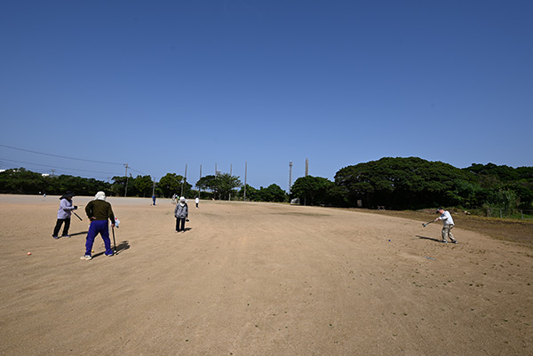 グラウンドゴルフ愛好会の活動日は、毎週月曜日と金曜日。渡慶次グラウンドへ集まりゲームを行っています。